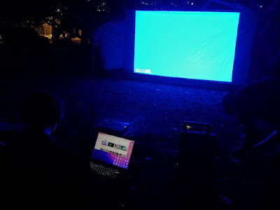 「若狭公民館に設置した蓄電池を利用して、震災が起こった際の夜の過ごし方の一つとして上映会ができるかどうか検討してみたい」という声があり、プログラムが終わった後に若狭公民館で行っている《うみそら上映会》の備品などを公園に運んで、急遽野外上映会を実施しました。