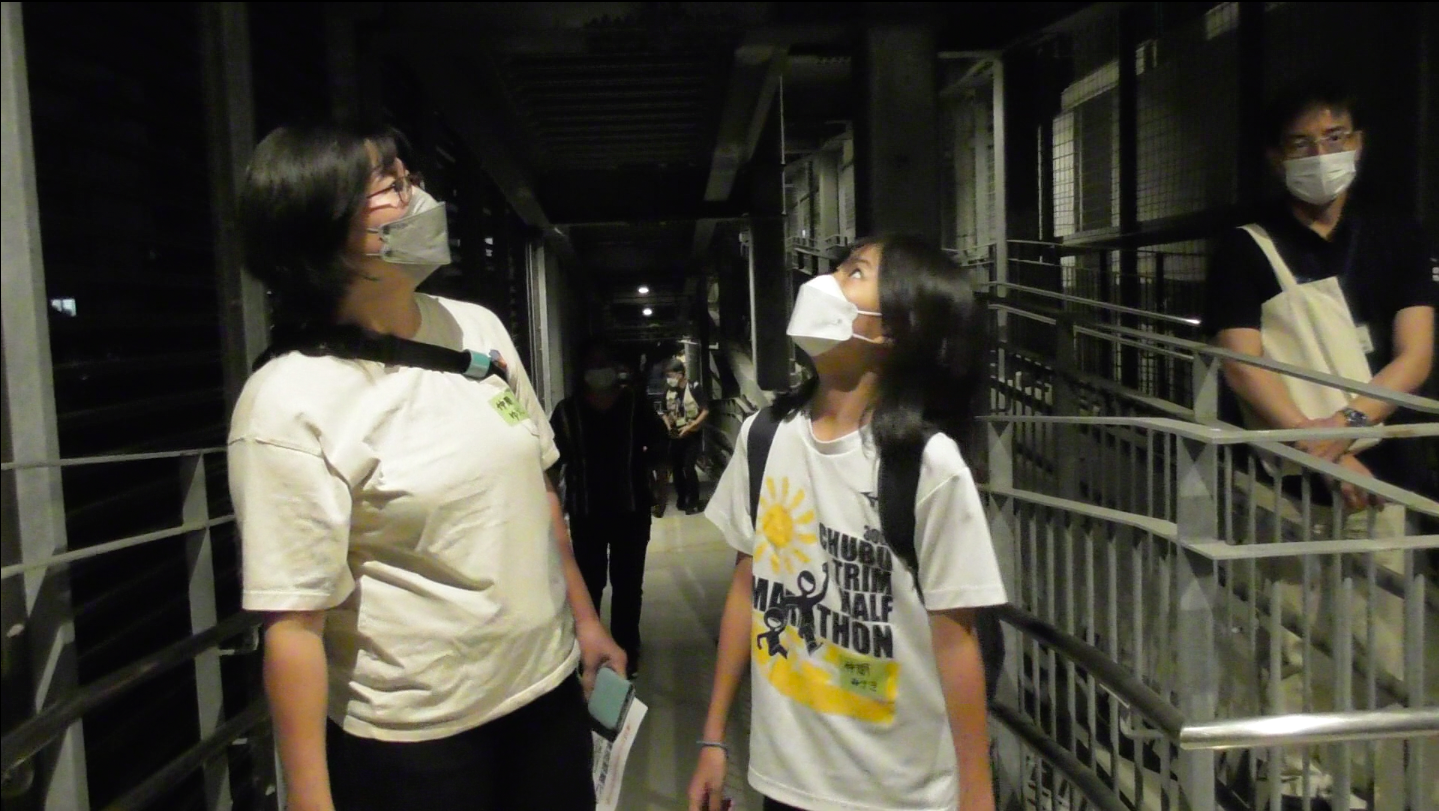 那覇市津波避難ビルの平時と非常時の機能について、那覇市津波避難ビル儀間館長に案内していただき、関連する補足コメントを防災士・災害ソーシャルワーカーである稲垣 暁 氏からいただきました。お二人のガイドのもと参加者と共にビル内・外をさんぽしながら学びました。