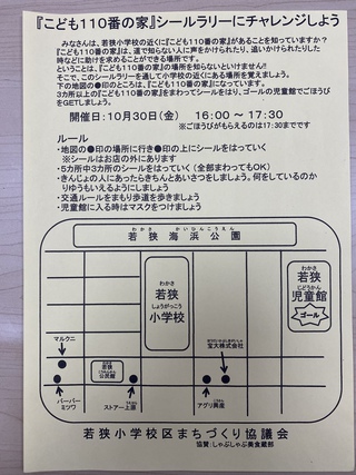 まわるのはマルク二さん、バーバーミツワさん、ストアー上原さん、アグリ興産さん、宝大株式会社さんの5箇所です。こども110番の家とは、知らない人に追いかけらたり、困ったりした時に助けを求めることができる場所です。公民館と児童館もあるので若狭小学校区は地域に守られてるな〜と感じます。